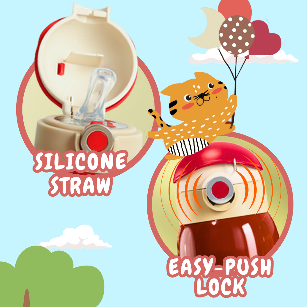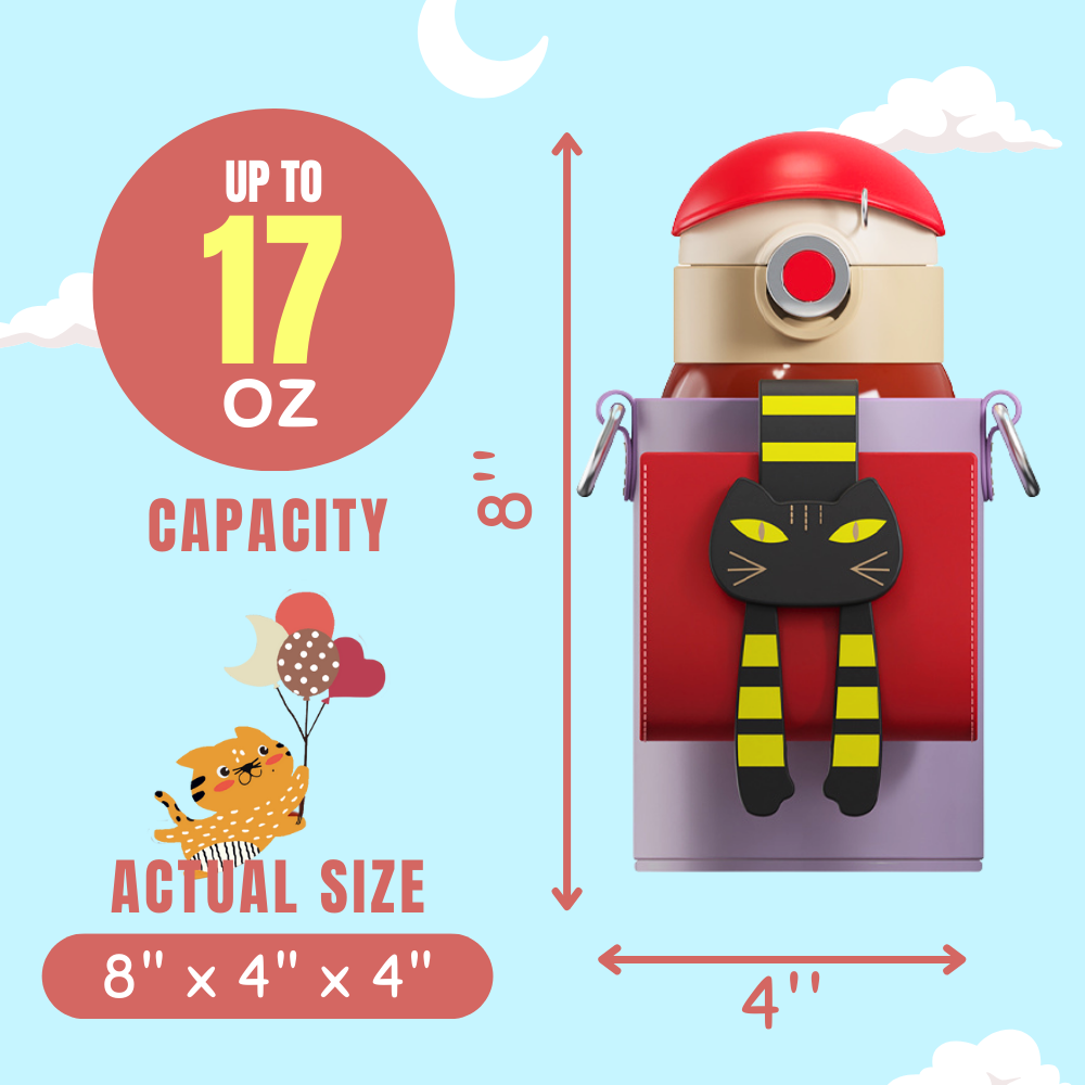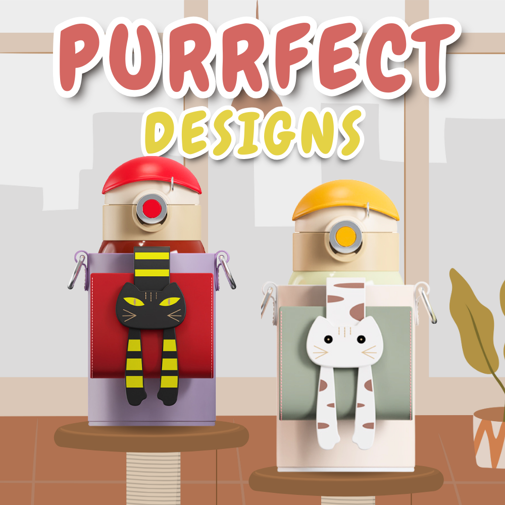Features: Lying cat design, double-wall insulation, leak-proof lid, easy-open button, carrying handle